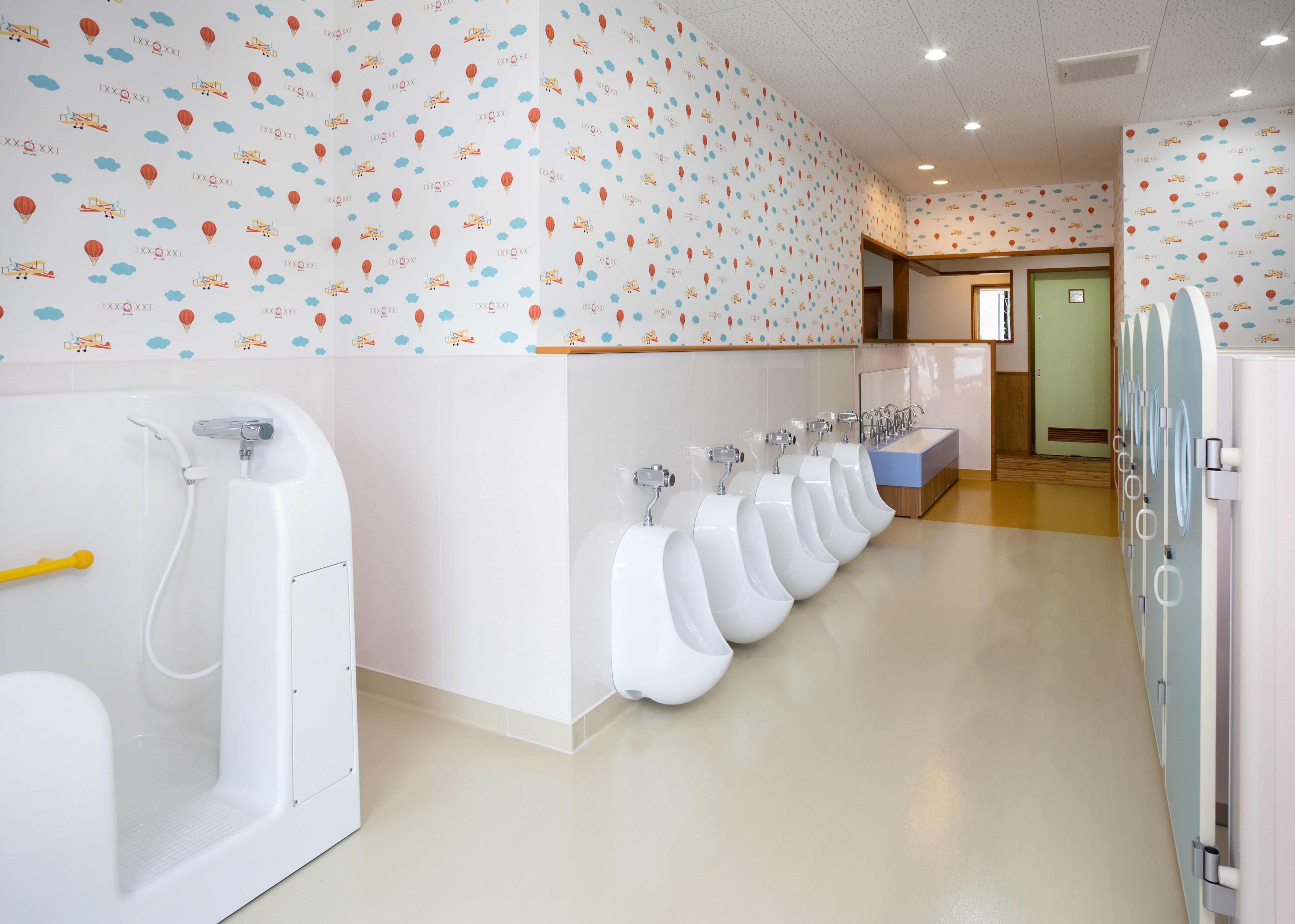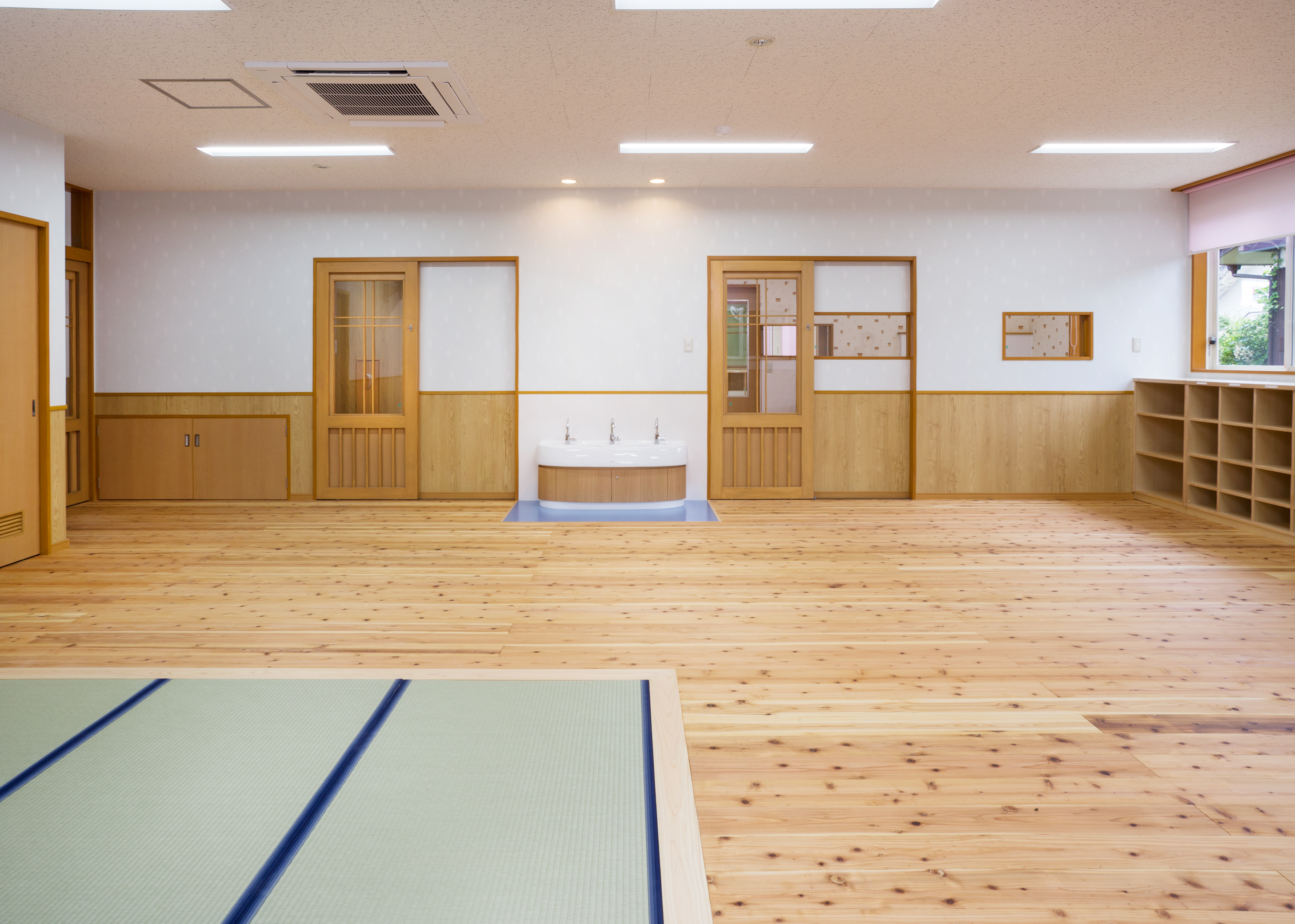 | 施設内容 | 乳児室1室72.87㎡ / 調乳室1室4.96㎡ 保育室4室190.43㎡ / ホール72.04㎡ 園児トイレ・沐浴・洗濯2室34.77㎡ / 厨房1室27.74㎡ 医務室兼相談室1室7.45㎡他 延べ床面積(建物全体)675.55㎡ |