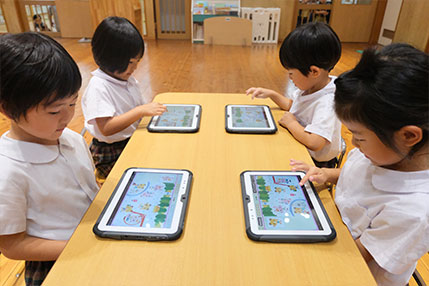 『タブレット学習』は、4・5歳児を対象に実施しています。2019年から小学校教育で導入された「GIGAスクール構想」は、子ども1人ひとりに最適化された学習を実現するための取り組みです。